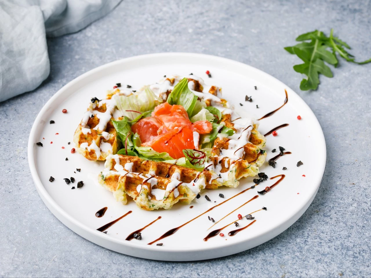 Вафля-драник с лососем и соусом голландез